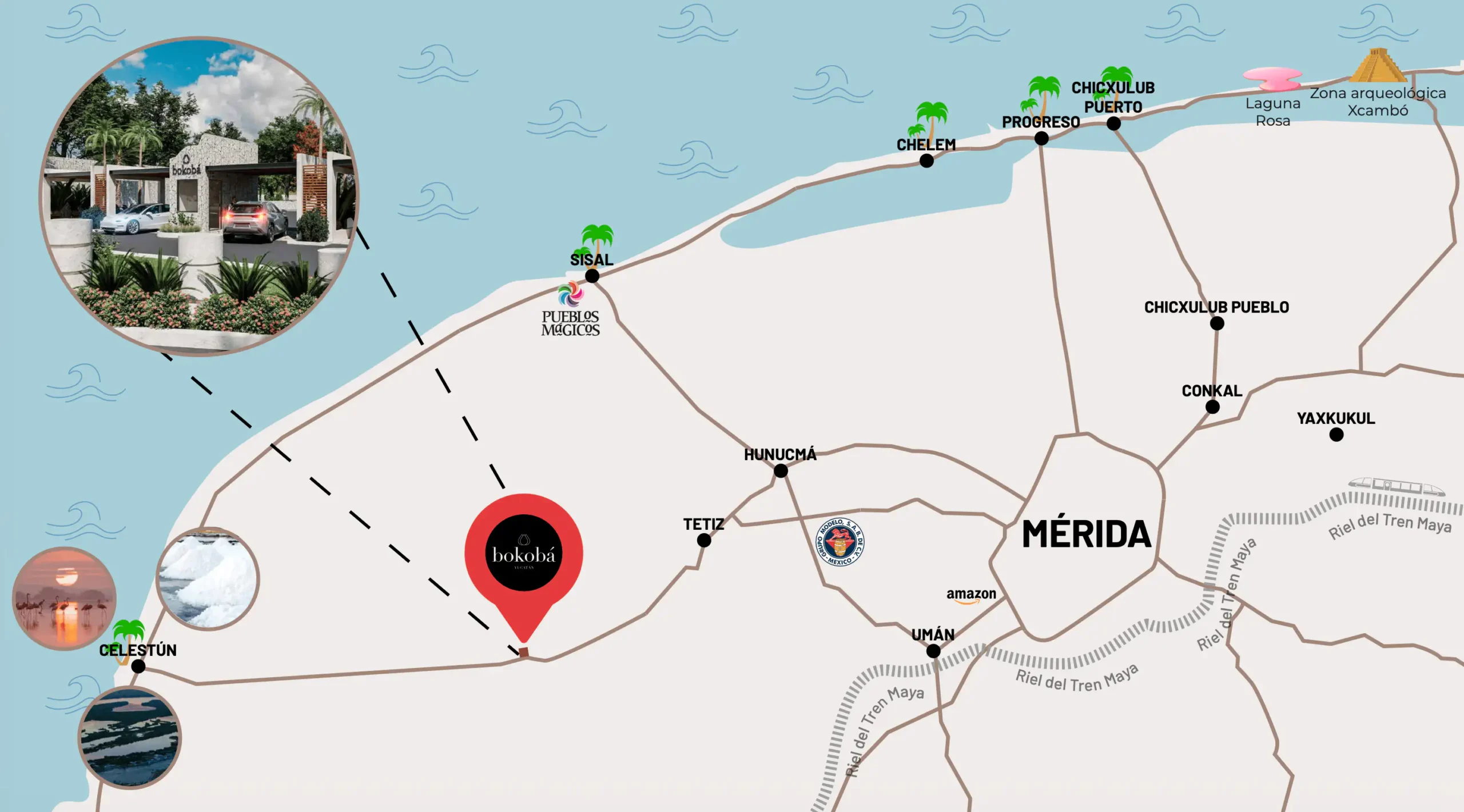Bokobá Residencial se ubica en Tetiz, una zona con gran proyección por su cercanía con Celestún, Mérida y corredores de conexión relevantes. Su ubicación permite disfrutar la tranquilidad del entorno, sin perder acceso a puntos clave para vivir, vacacionar o invertir.